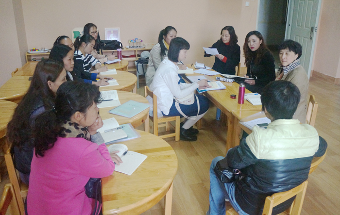 根据2015“国培计划”项目工作要求,在围绕“集中研修、跟岗实践、返岗培训、总结提升”等四个阶段的任务基础上,为了更好地满足参训学员后续的送培下乡和培训实践的要求,必须要建立以导师团队为核心的研修工作坊。教师教育公司为本次参训的来自安宁、楚雄、保山、广南、芒市等五地州的学员每10名一组成立了由高校培训专家、教研员和一线优秀园长或教师组成的“三人行”学科导师组,全程指导学员研修。