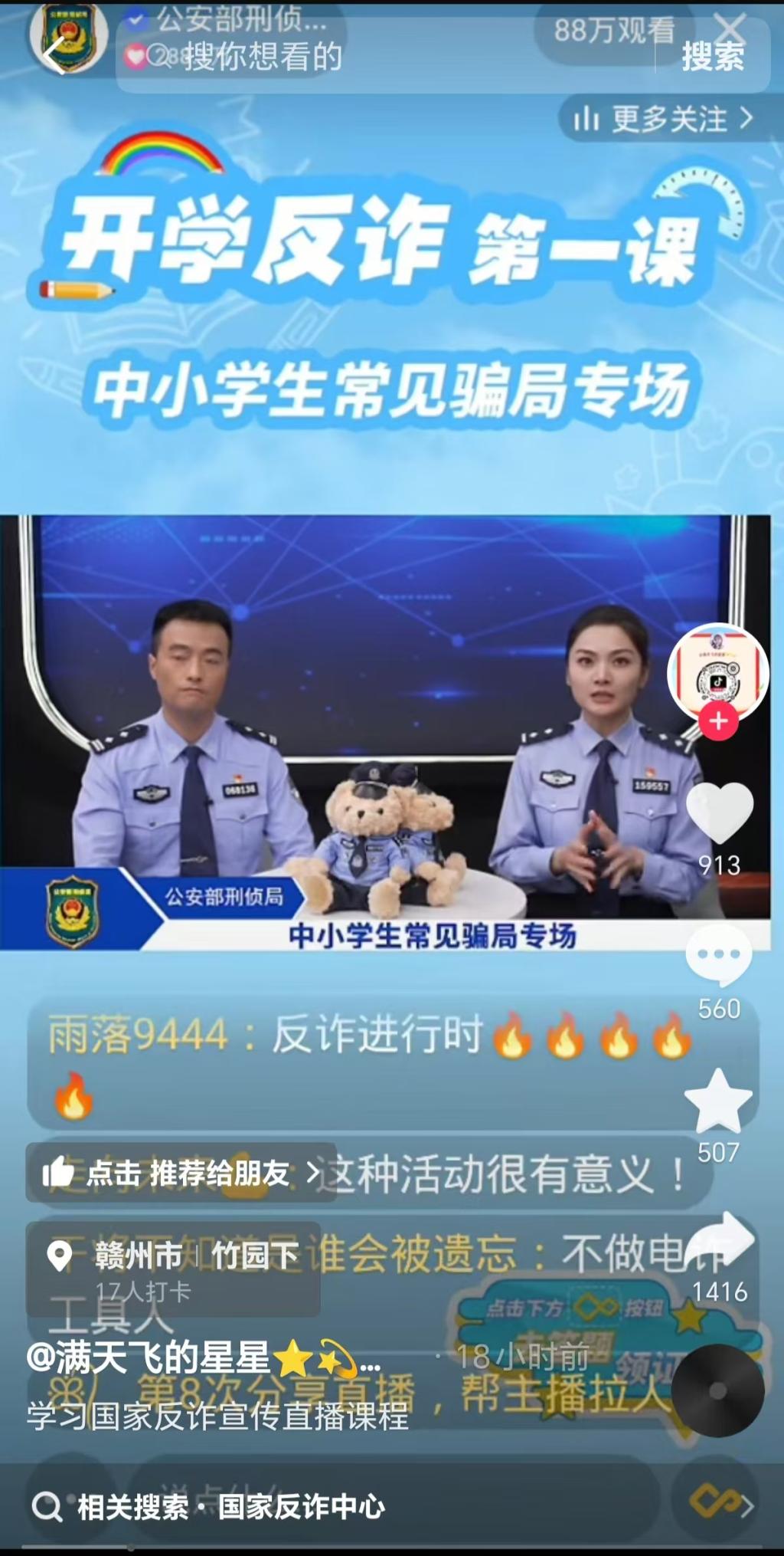 另外,根据公司保卫处下发的《关于组织观看“开学反诈第一课”线上直播的通知》要求,组织大家观看了国家反诈中心的线上直播节目。通过此次反诈讲座和观看反诈直播节目,使同学们掌握了一定的预防电信诈骗的知识,增强了预防电信诈骗的能力,为避免同学们的财产损失起到了积极作用。