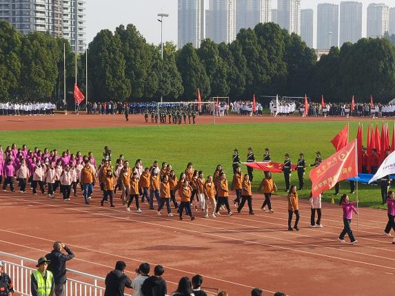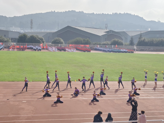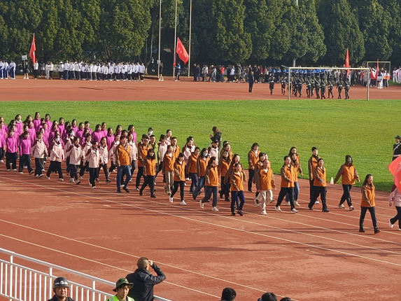 由学特公司负责的鲜花队员们手持鲜花,以优雅的姿态和整齐的步伐走过操场,为运动员们送上最真挚的祝福。